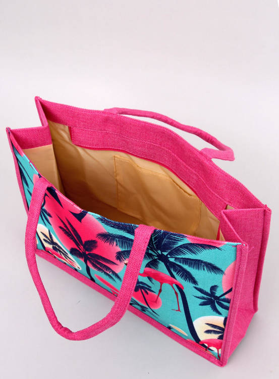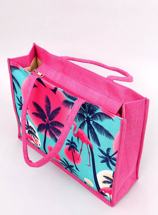 Dámska plážová taška. Prednú stranu zdobí najmódnejší motív plameniakov :) Taška sa zapína na zips. Vnútro tašky je lemované podšívkou s malým pútkom. Je veľmi priestranný a zároveň ľahký - ľahko sa do neho zmestí všetko najnutnejšie, čo sa vám bude hodiť na pláž alebo prechádzku. Vonkajší materiál - látka.